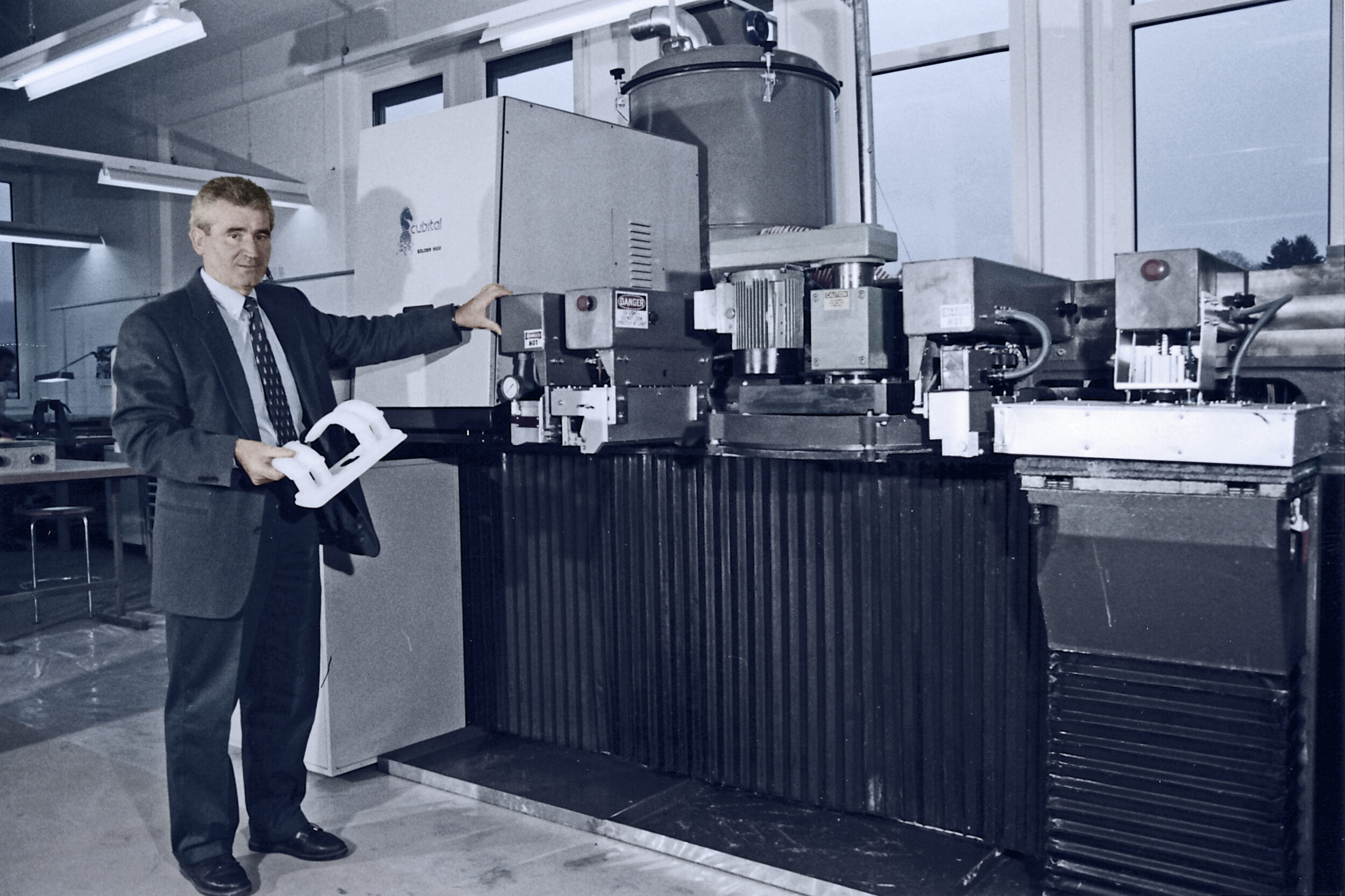 Mit der Anschaffung einer der ersten Solid Ground Curing (SGC)-Anlagen von CUBITAL betritt die VON ALLMEN AG Neuland. Das riesige System, ein Vorläufer moderner Rapid-Prototyping-Technologien, revolutioniert den Modellbau. Dank dieser Investition können erstmals innert kürzester Zeit Prototypen und Urmodelle hergestellt werden – ein Meilenstein, der die Weichen für die Zukunft stellt.